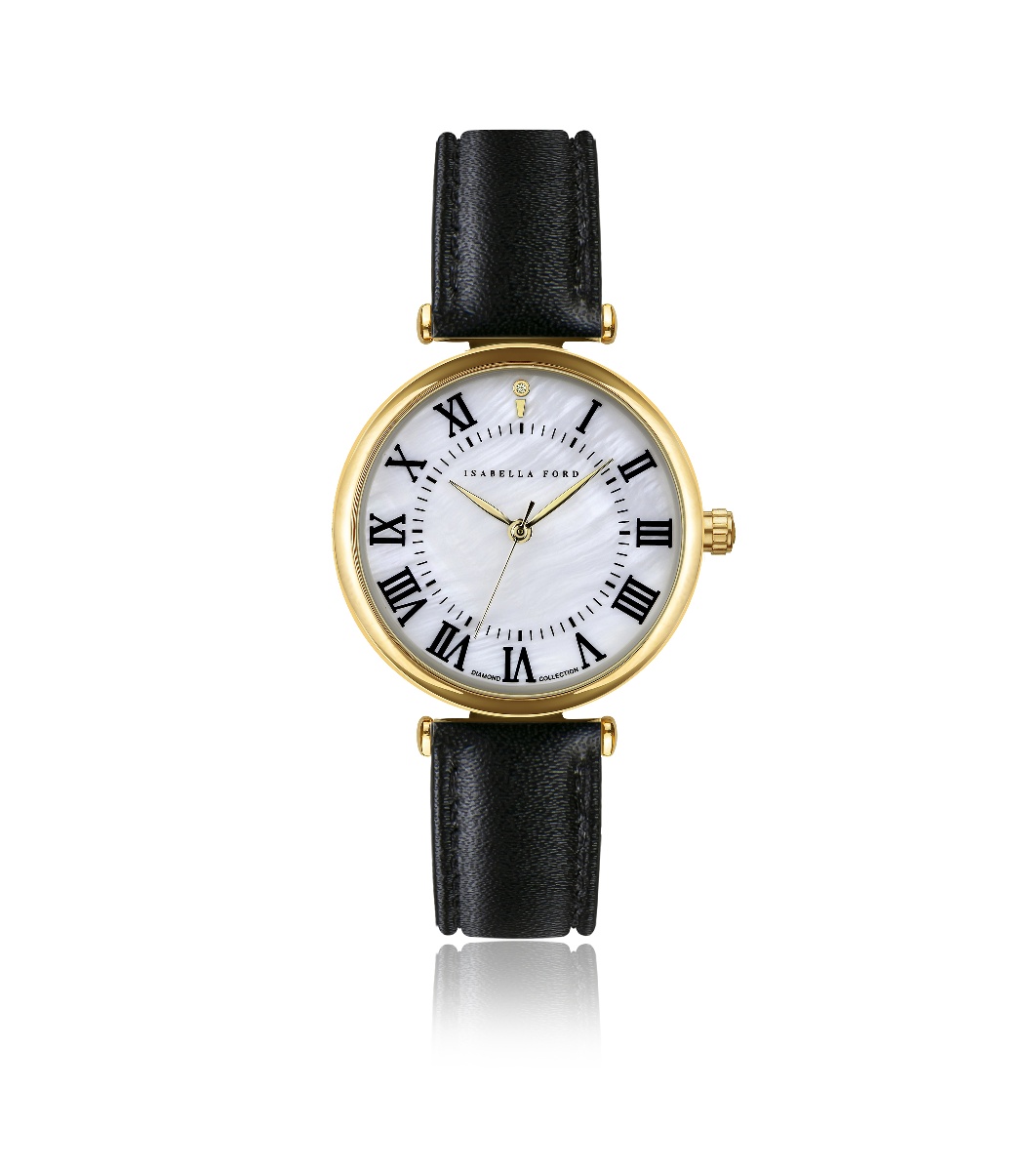 Isabella Ford Ceas ÉLODINE negru cu curea din piele netedă, căptușită Ceas de damă cu carcasă rotundă de culoare aurie și diametru de 32 mm.