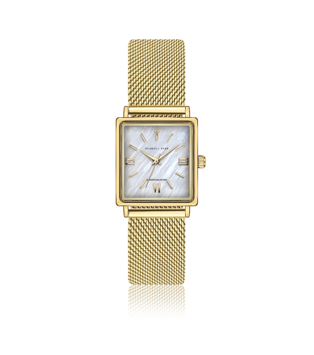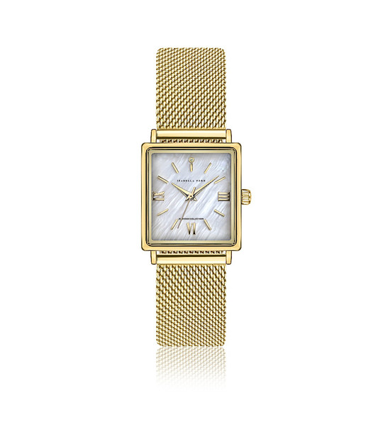 Isabella Ford Ceas Mireille Gold Mesh Ceas analog de damă cu carcasă dreptunghiulară de 26 × 34 mm și lanț din plasă aurie.