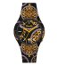 Ceas cu mecanism cu cuarț și afișaj analog. Design distinctiv cu motive decorative pe cadran și curea.