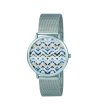 Ceas cu mecanism cu cuarț și afișaj analog. Carcasă rotundă cu diametrul de 40 mm. Afișajul este decorat cu motive geometrice. Lanț cu design de plasă.