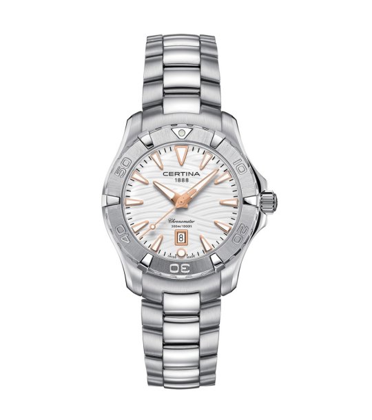 Ceas elegant de damă cu afișaj analog. Oferă rezistență la presiune de până la 30 ATM, potrivit pentru scufundări la mare adâncime.
