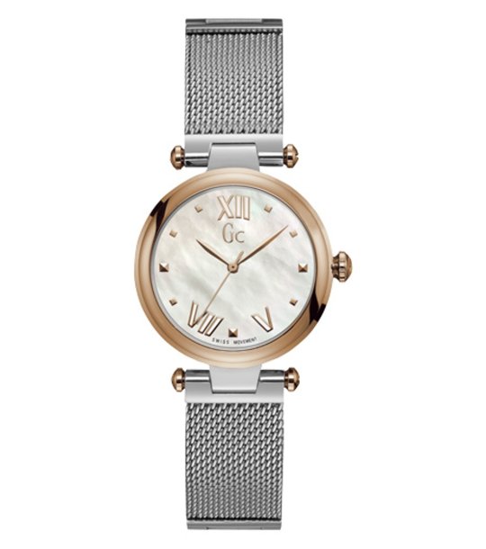 Ceas elegant cu cadran rotund și cifre romane. Are un lanț fin și un design clasic.