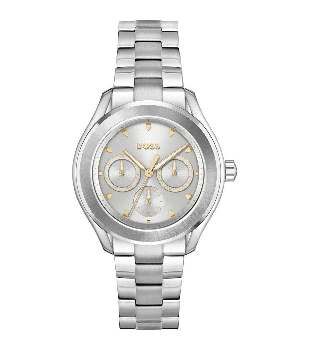 Acest ceas unisex are un afișaj analog clasic.