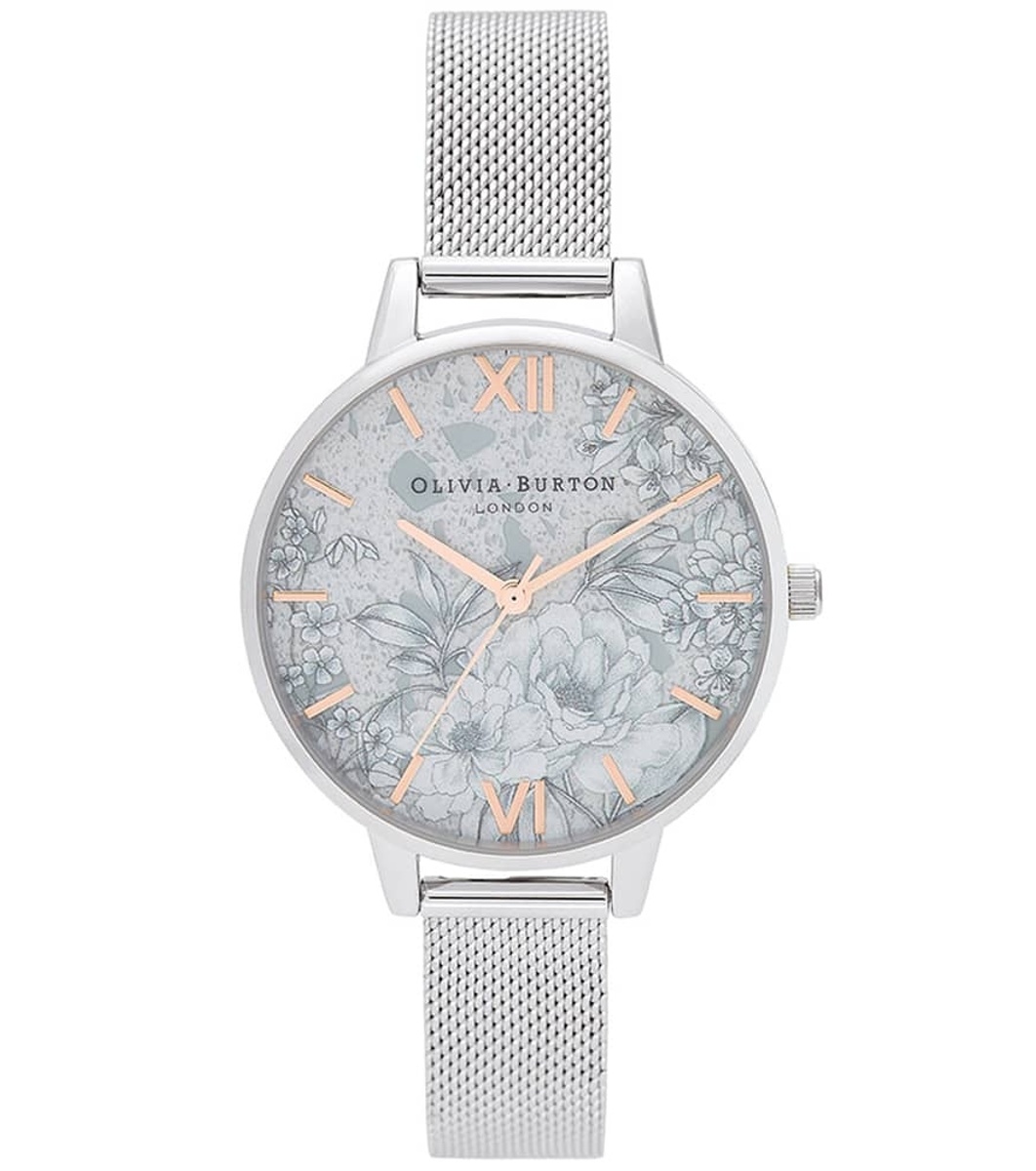 Ceas elegant de damă cu afișaj analogic și motive florale.