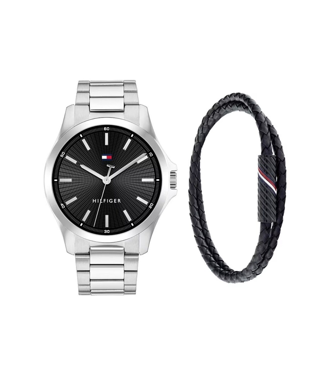 Ceas analogic cu mecanism cu cuarț, însoțit de o brățară împletită. Ceasul are un afișaj rotund și o sticlă de protecție. Brățara adaugă un accent elegant setului.