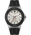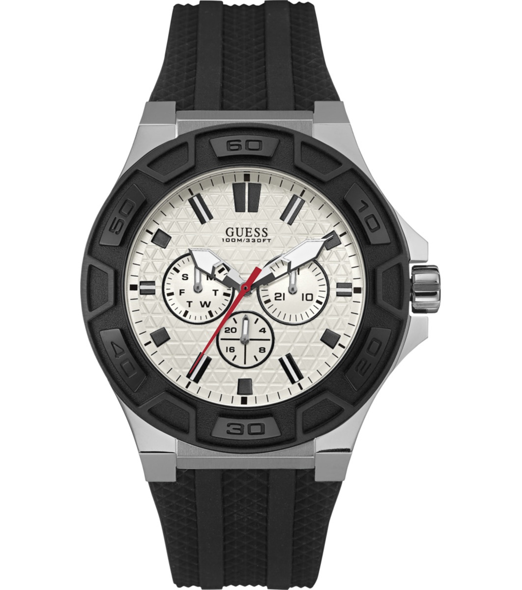Ceas analogic bărbătesc cu afișaj rotund. Există trei cadrane suplimentare pentru dată și oră. Luneta are indicații pentru minute. Rezistent la apă până la 100 de metri.