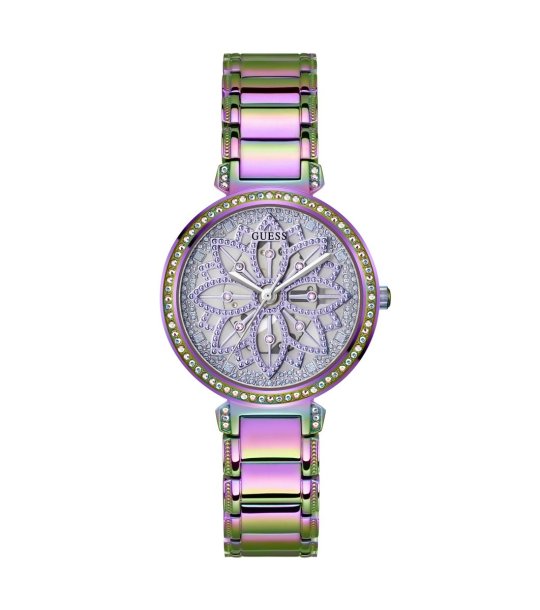 Ceas elegant de damă cu afișaj analogic și mecanism cu cuarț. Prezintă un design elegant și un cadran decorat.