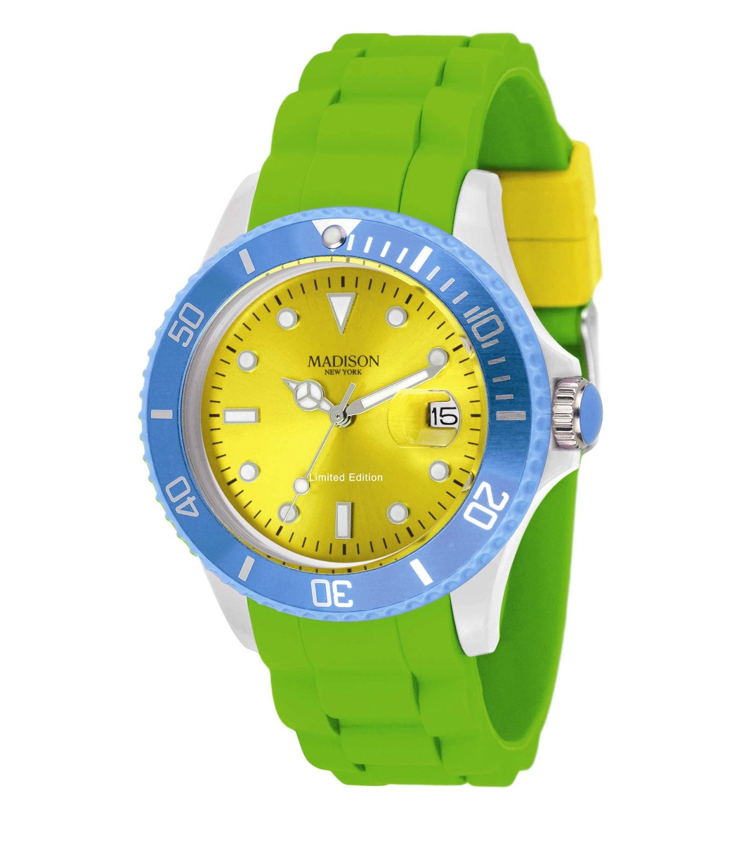 Ceas cu afișaj analogic și mecanism cu cuarț. Diametru afișaj 40 mm. Rezistent la presiune până la 5 atm.