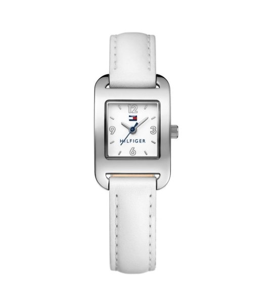 Ceas elegant cu formă dreptunghiulară și afișaj analogic.