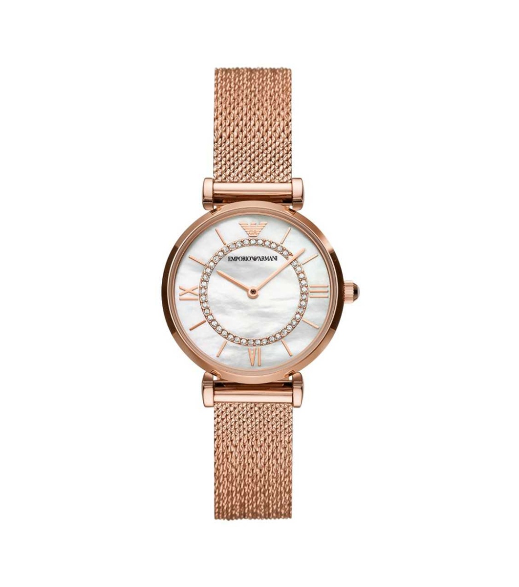 Елегантен дамски часовник с аналогов дисплей и мрежеста верижка.