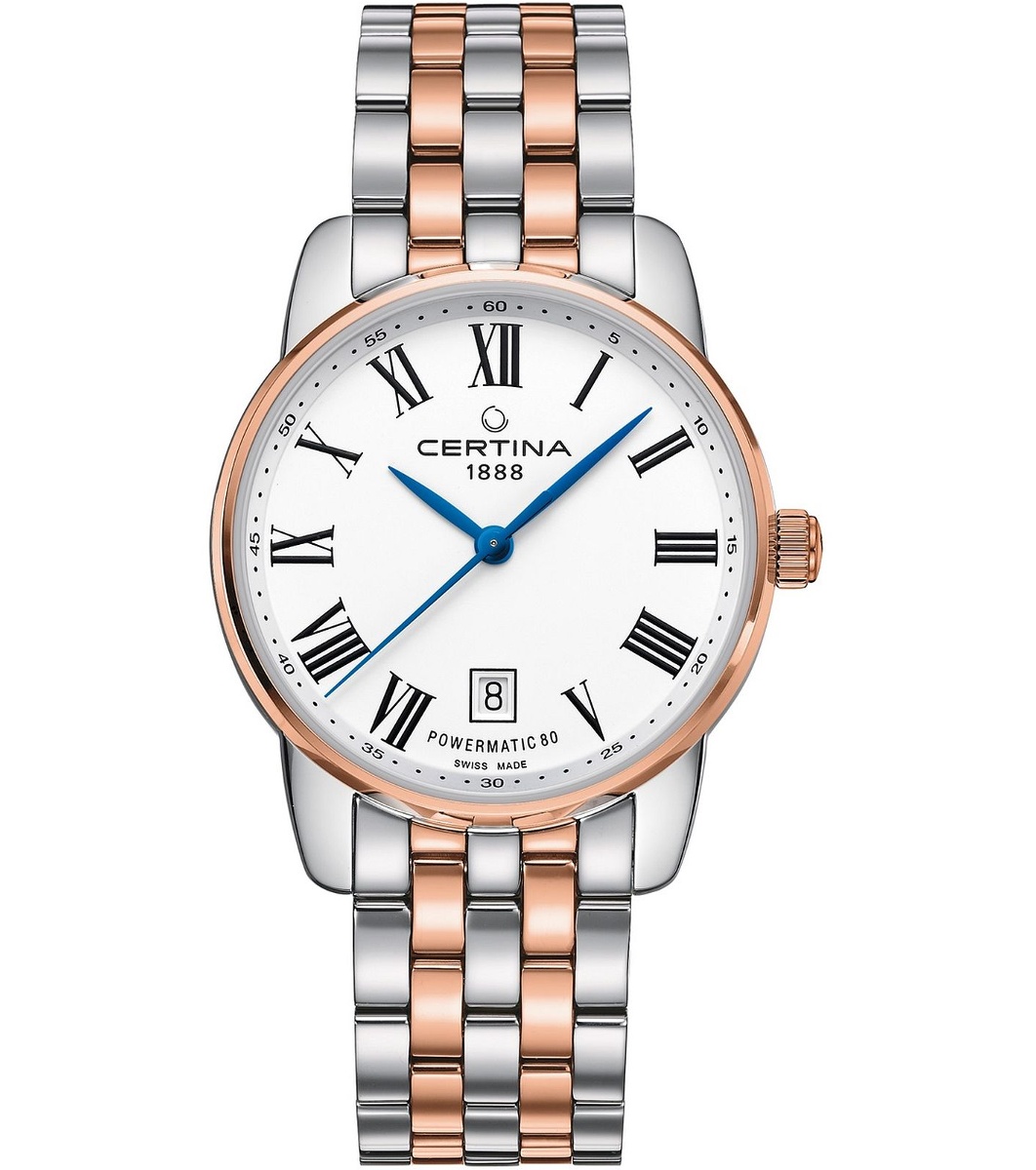 Ceas analogic cu mecanism automat și cifre romane. Cadran alb cu fereastră pentru dată. Sticlă safir și lanț metalic.