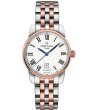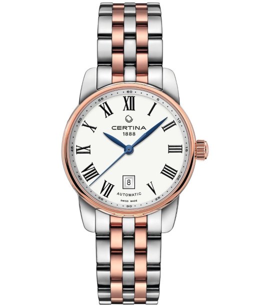 Ceas elegant de damă cu mecanism automat și afișaj analogic. Lanțul are un design clasic. Cadranul are cifre romane și un indicator de dată.