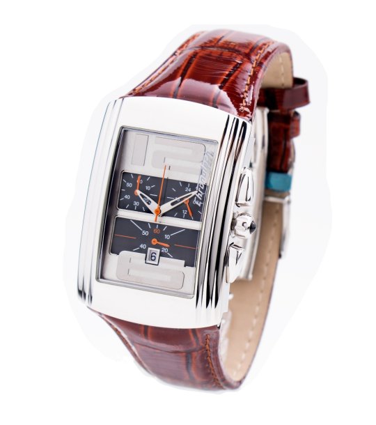 Ceas analogic cu afișaj dreptunghiular și cadran cu indici. Include butoane laterale și dată. Închidere cu cataramă.