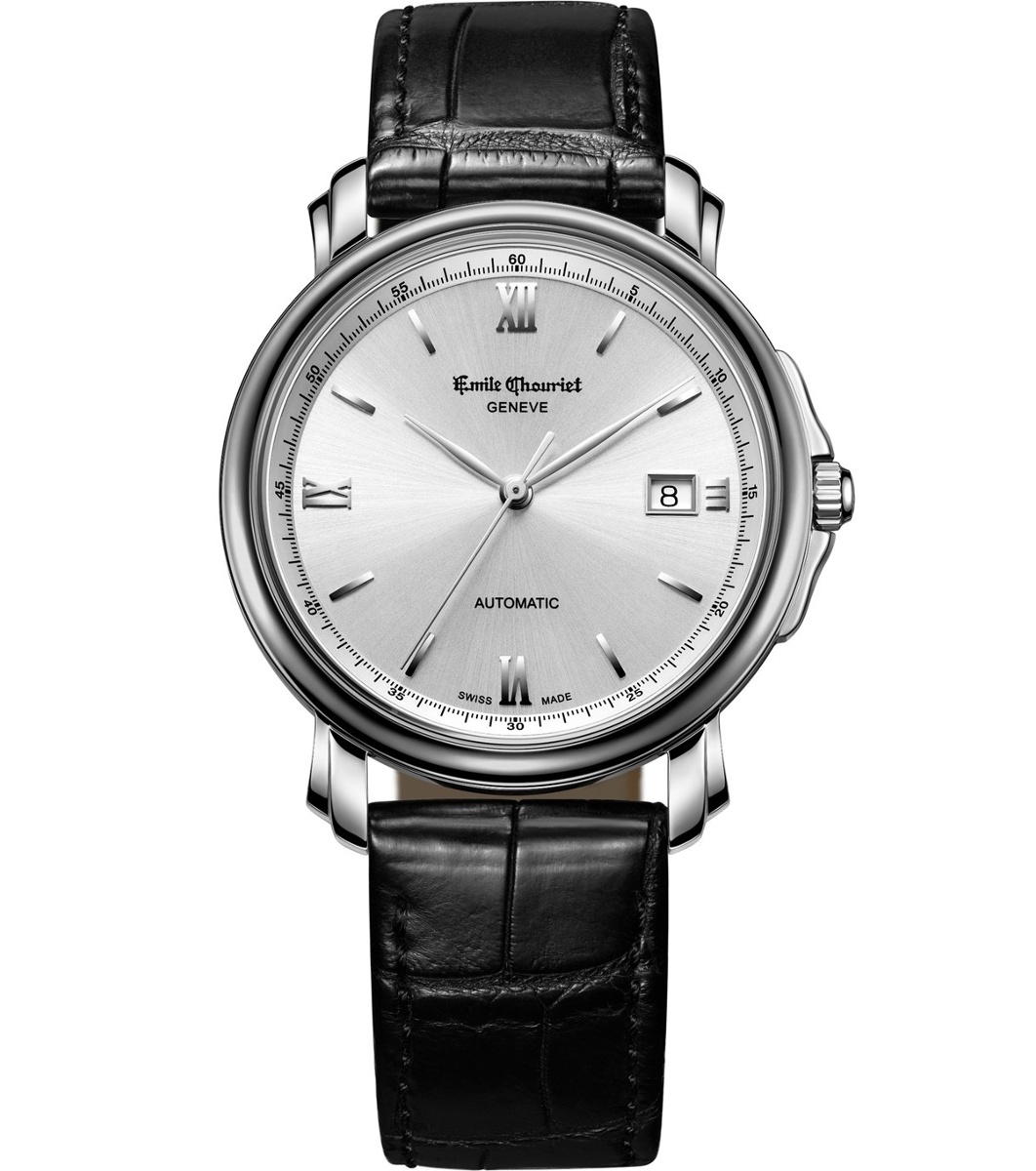 Ceas bărbătesc elegant, cu mecanism automat și afișaj analog. Carcasa este rotundă, iar afișajul are cifre romane și dată.