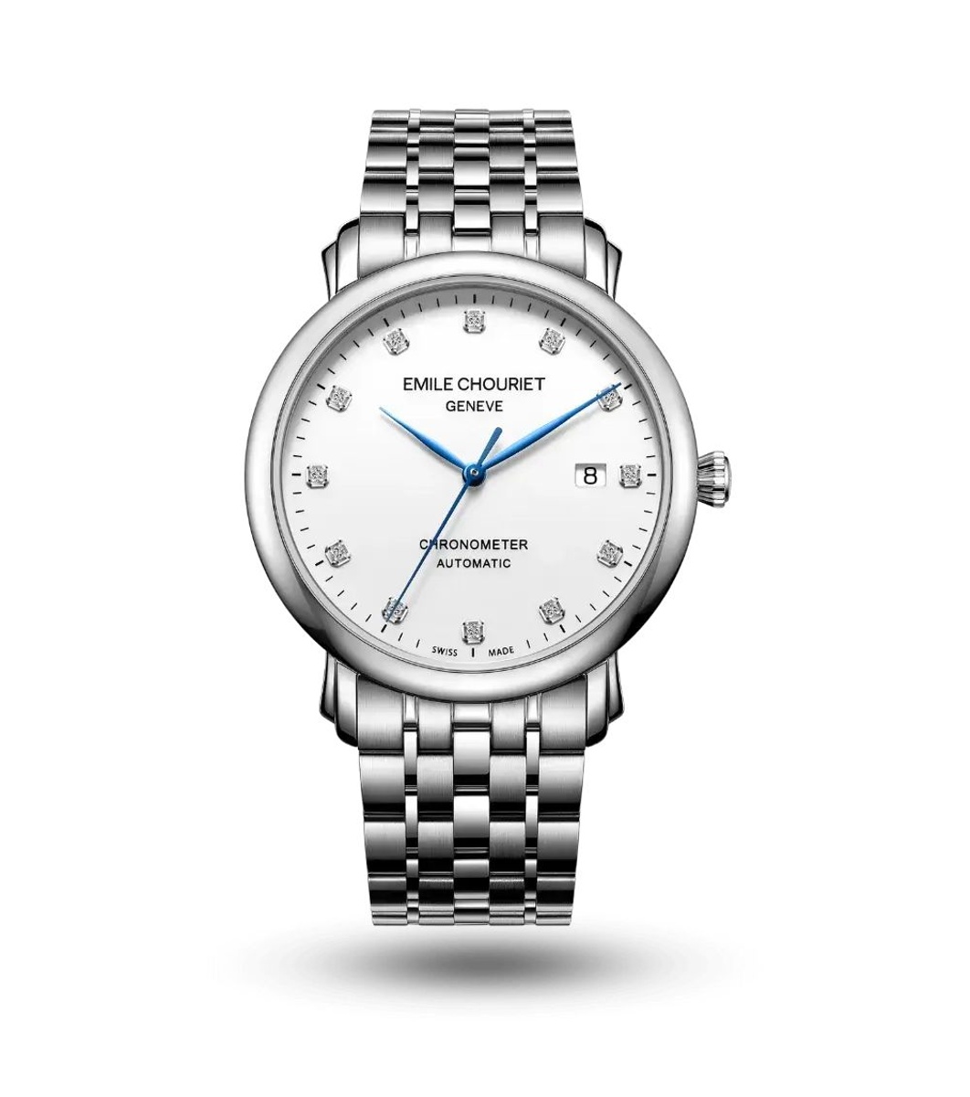 Ceas bărbătesc elegant cu mecanism automat și afișaj analog. Prezentat cu o carcasă rotundă și cadran clasic.