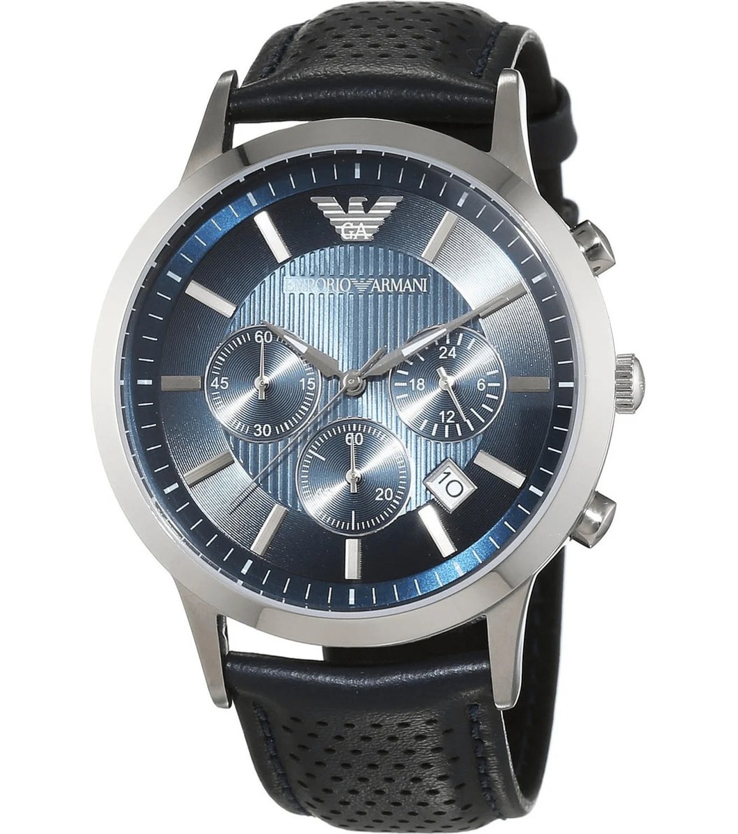 Ceas bărbătesc elegant cu afișaj analogic și funcții cronograf. Are trei cadrane mici pentru măsurători suplimentare și dată. Rezistența la apă este de 5 ATM, potrivit pentru utilizarea zilnică.