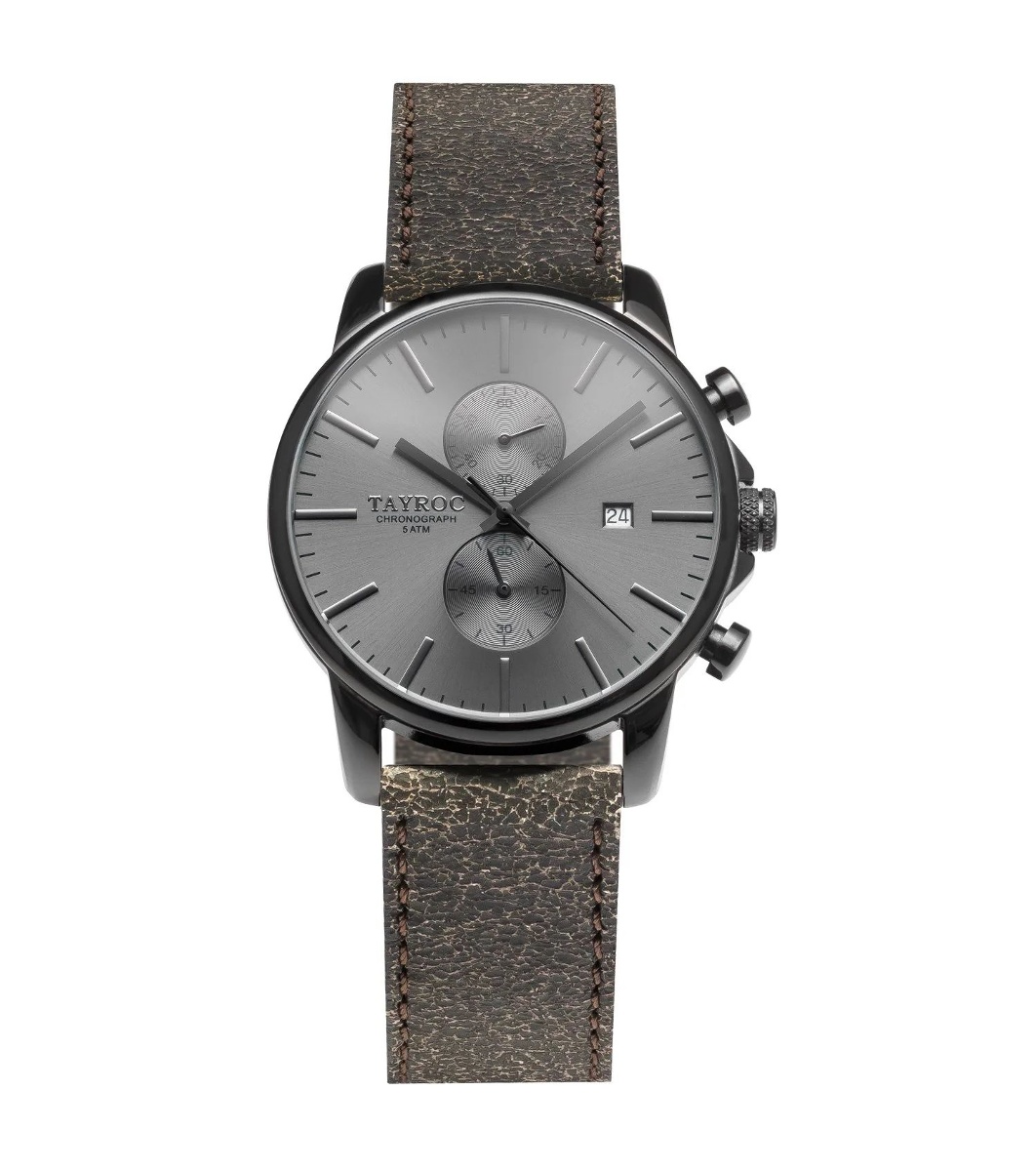 Ceas cu afișaj analogic și funcții cronograf. Prezintă trei cadrane mici și dată.