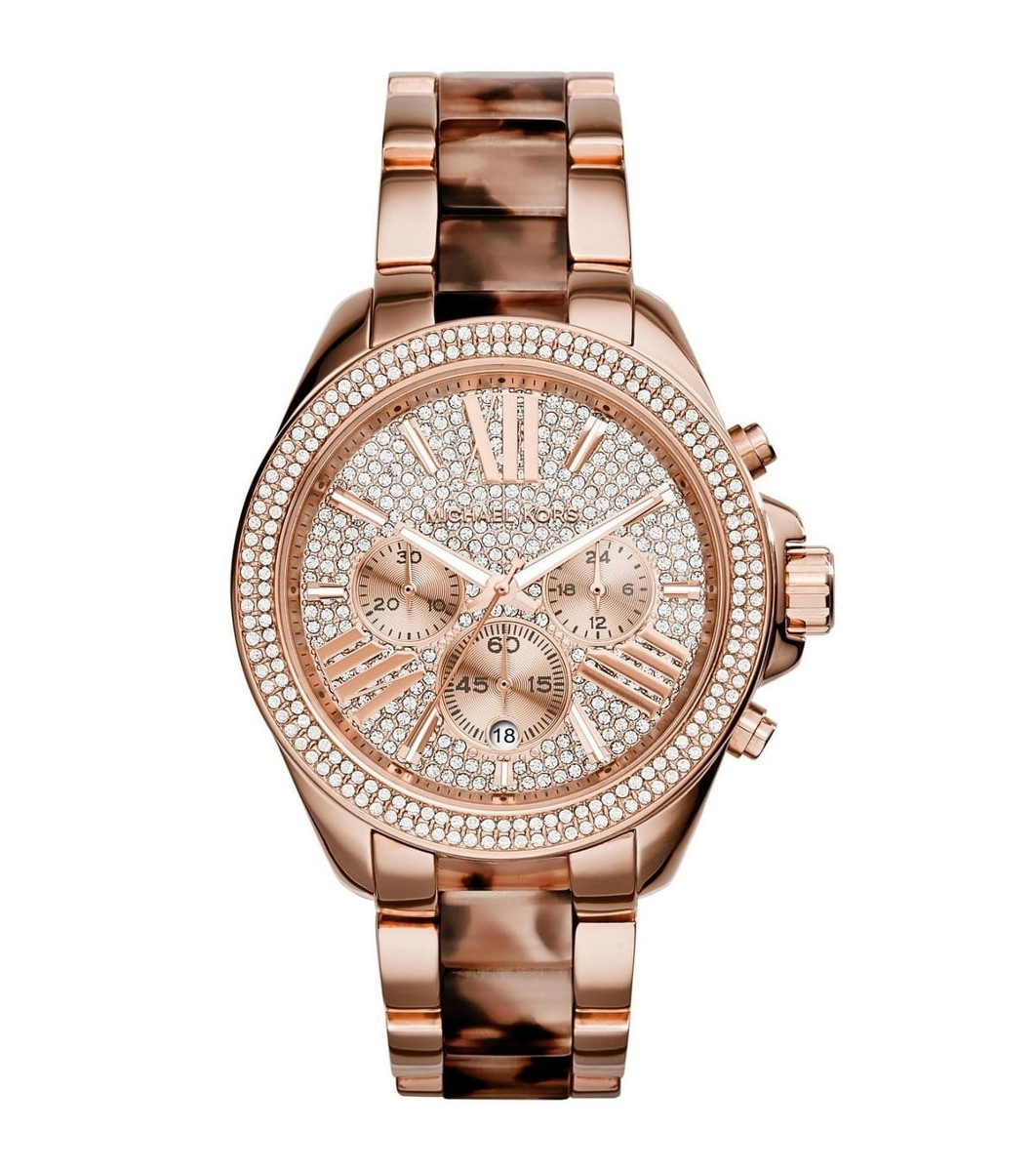 Ceas elegant de damă cu afișaj analogic și funcție cronograf. Diametrul afișajului de 41,5 mm și rezistență la presiune de până la 10 ATM.
