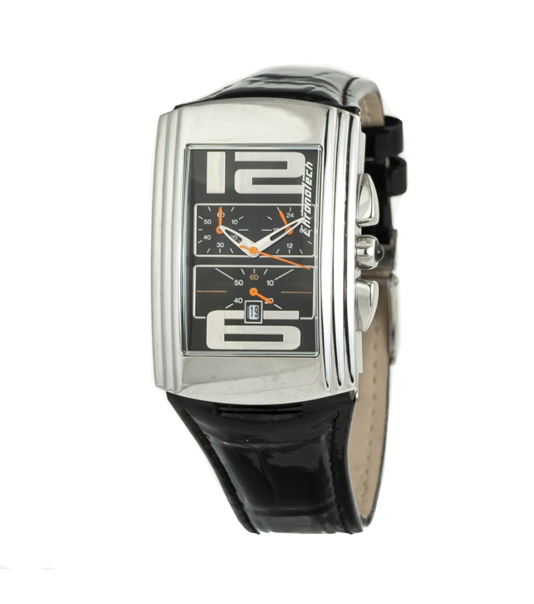 Ceas elegant cu cadran dreptunghiular și afișaj analog. Prezintă cadrane suplimentare pentru cronograf și dată. Ușor de purtat datorită curei din piele și sticlei minerale.
