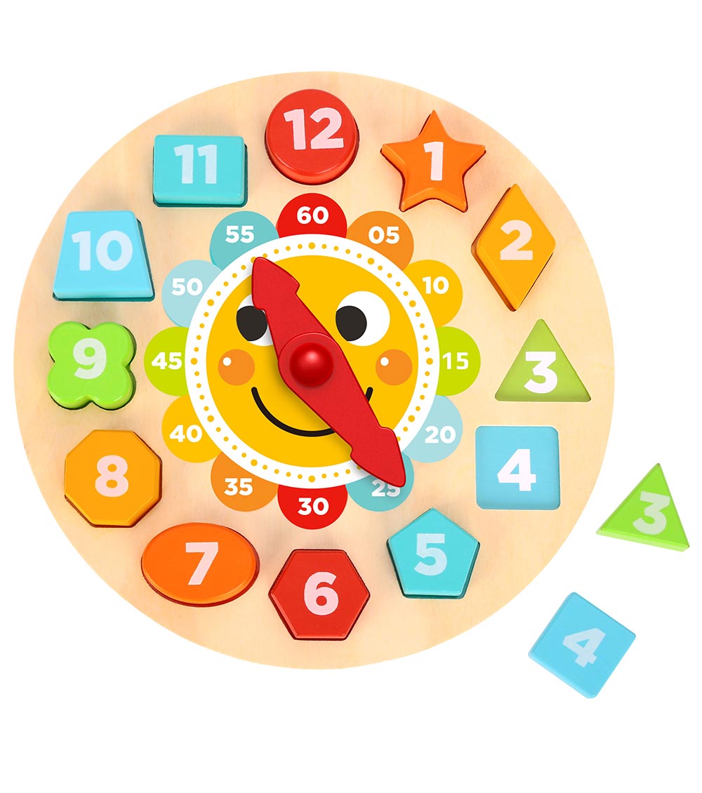 O jucărie combinată interesantă care îl va ajuta pe copil să știe cât este ceasul, să cunoască diferite forme și culori, precum și să învețe numerele până la 12.