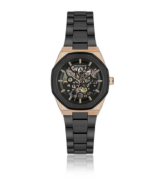 Walter Bach Ceas de bărbați negru cu carcasă din aur roz Mișcare cu quartz japonez