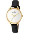 Ceas cu cuarț cu afișaj analogic și carcasă metalică.