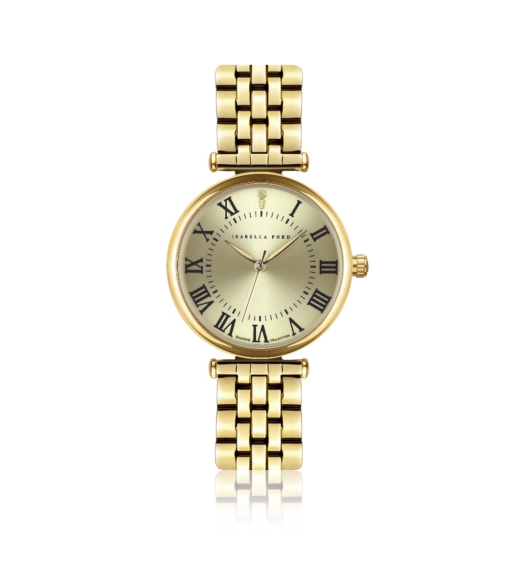 Isabella Ford Ceas de damă auriu cu lanț JULIENNE GOLD LINK Ceas de damă din colecția Julienne cu carcasă metalică de culoare aurie și cadran auriu cu efect de soare, cifre romane și cristal unic.