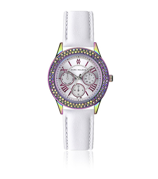 Marc Malone Ceas de damă cu carcasă multicoloră cu cristale și curea albă Afișaj analogic