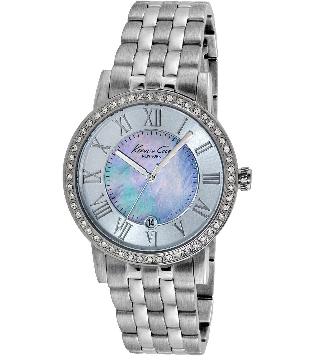 Ceas elegant de damă cu afișaj analogic și formă rotundă. Ceasul are cifre romane și cristale încrustate în jurul cadranului.