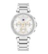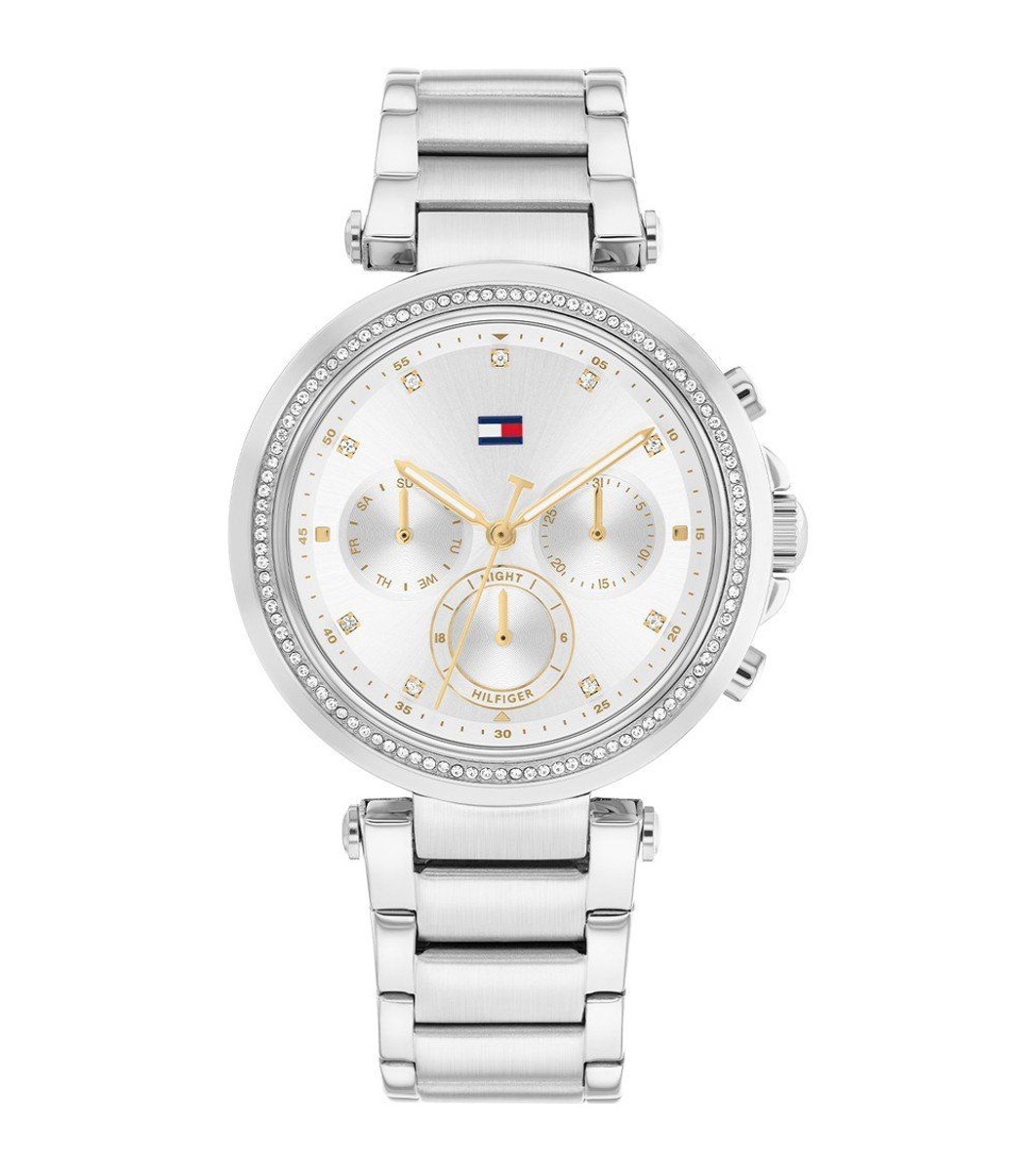 Ceas elegant de damă cu afișaj analog și design curat. Rama este decorată cu detalii fine, iar acele și indexurile sunt clar vizibile. Funcționalitățile includ mai multe cadrane suplimentare pentru date și zile ale săptămânii. Potrivit pentru purtarea zilnică.