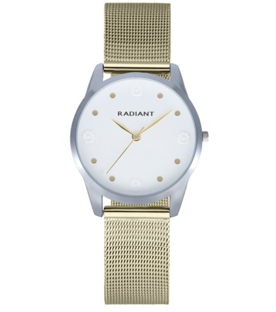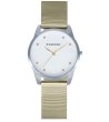 Ceas elegant de damă cu afișaj analogic și lanț din plasă. Prezintă un cadran curat și marcaje fine.