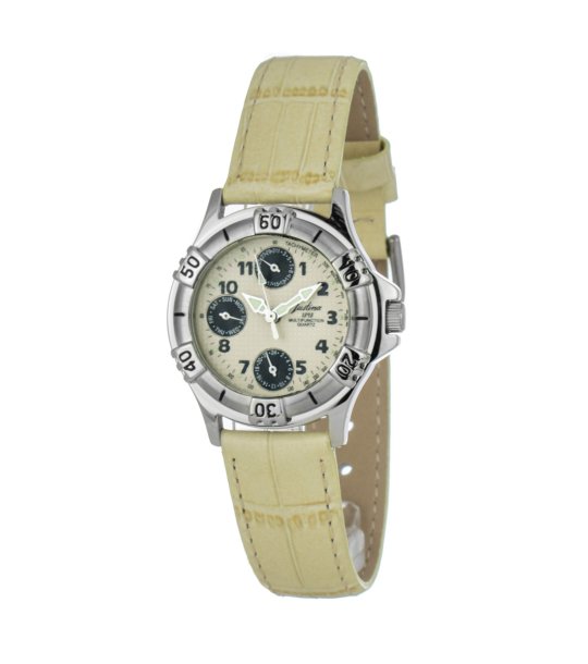 Ceas elegant de damă cu afișaj analogic și design curat. Are mai multe cadrane mici pentru funcții suplimentare.