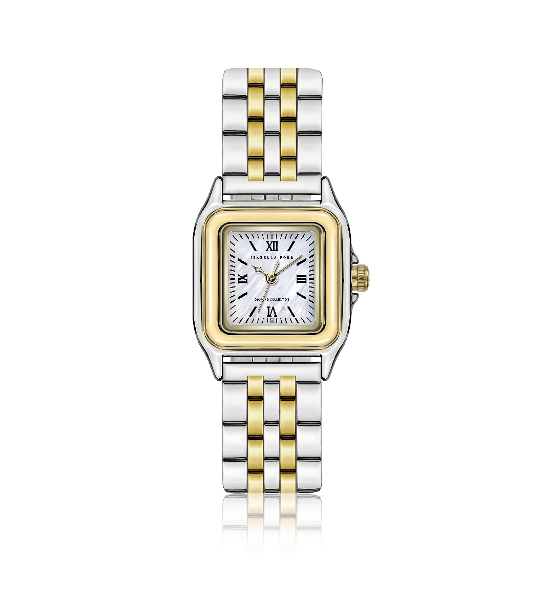 Isabella Ford Ceas de damă din argint și auriu Vivienne Ceas de damă cu carcasă dreptunghiulară și lanț metalic din auriu și argintiu.