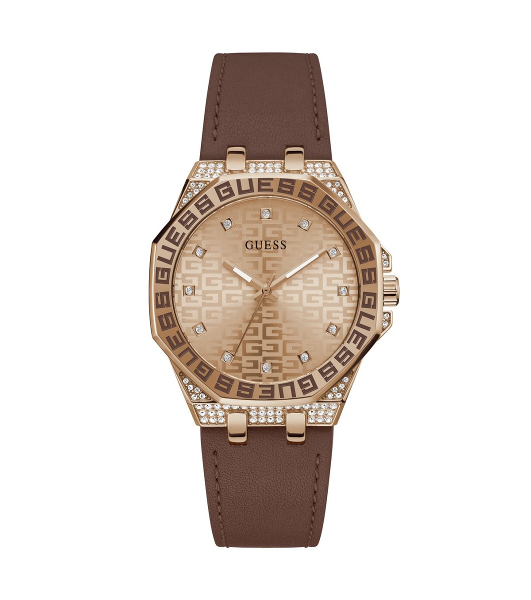 Un ceas cu design elegant și afișaj analog. Are un cadran rotund și cristale decorative în jurul său.