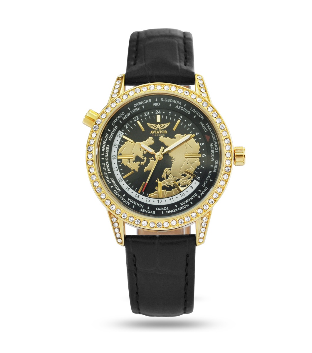 Un ceas de damă sofisticat cu afișaj analogic și un design elegant. Carcasa este decorată cu elemente strălucitoare și are o hartă a lumii pe cadran.