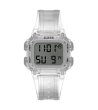 Ceas digital cu afișaj dreptunghiular și curea transparentă. Are funcții de măsurare a timpului și este rezistent la presiune de până la 5ATM.