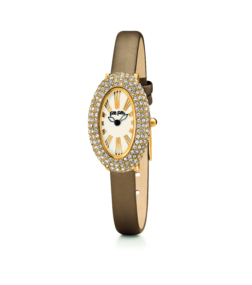 Ceas de damă cu design elegant și carcasă ovală. Ceasul are un afișaj analog și o curea fină. Oferă un aspect elegant pentru ocazii speciale.