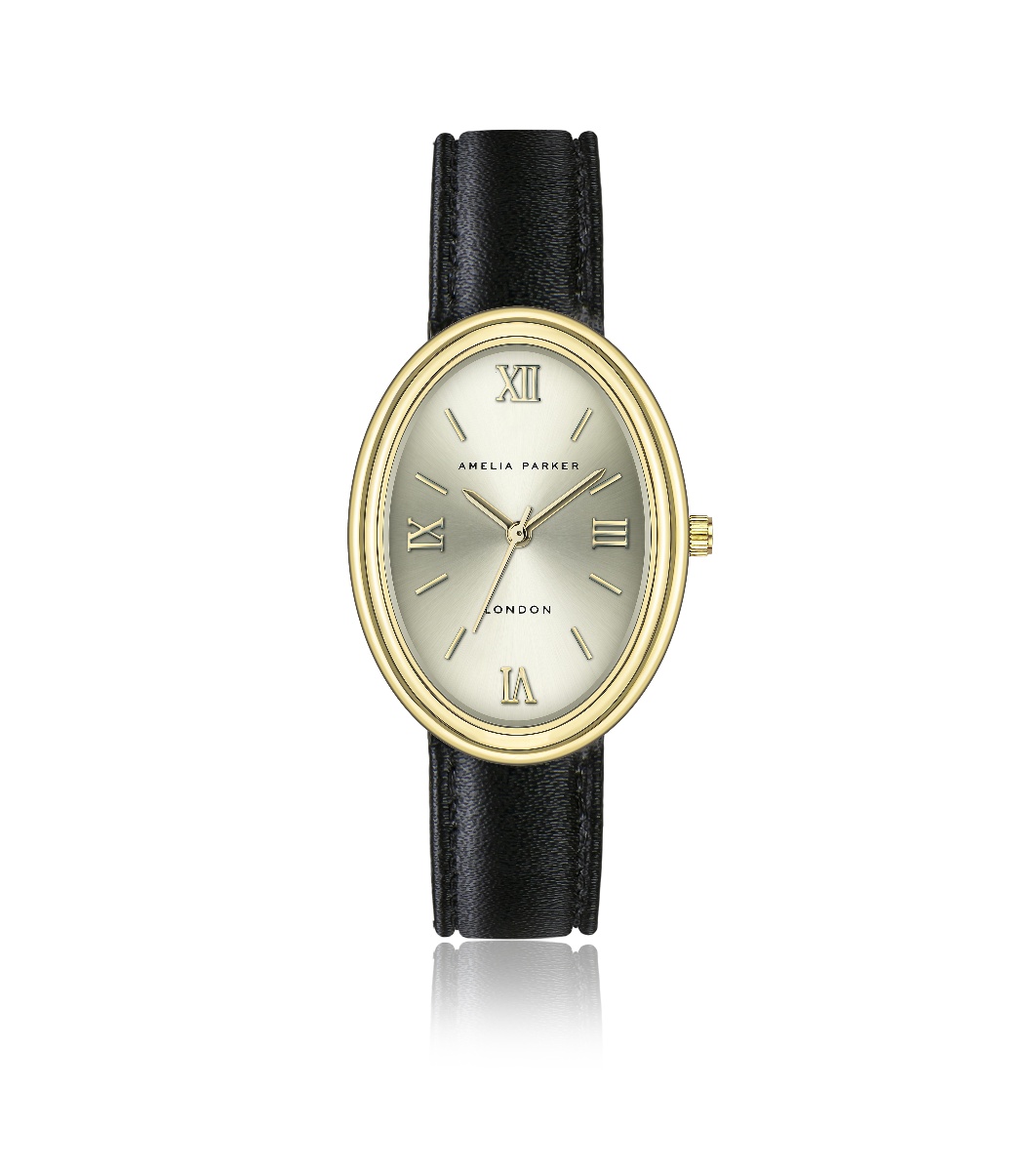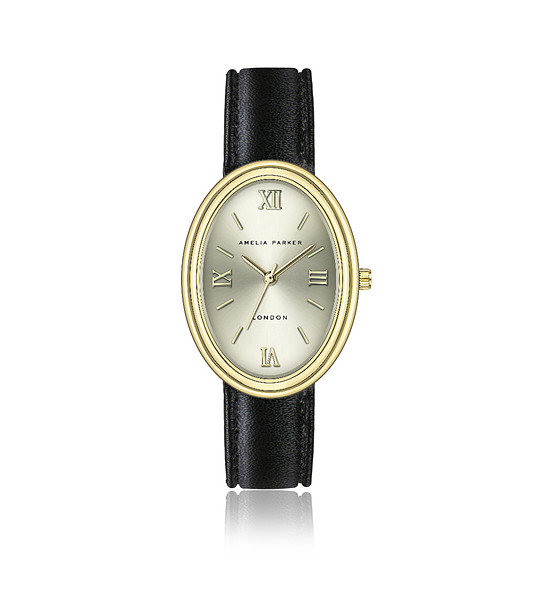 Amelia Parker Ceas oval auriu de damă cu curea din piele neagră Créma Cadran analog
