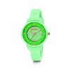 Ceas de damă cu afișaj analogic și elemente decorative pe cadran. Are o curea din silicon cu design în relief și sticlă minerală.