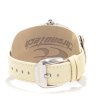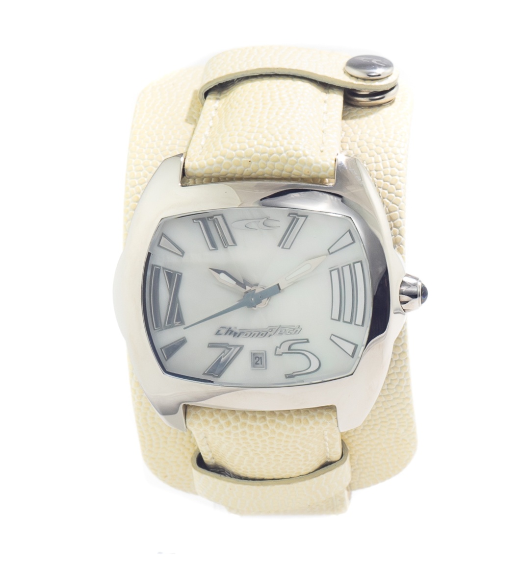 Afișaj analogic cu cifre romane și indicator suplimentar de dată. Curea lată cu textură în relief și încuietoare cu nituri. Carcasă și cadran moderne cu un design interesant.