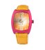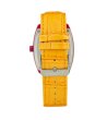 Un ceas dreptunghiular cu afișaj analog. Are sticlă minerală și o curea cu un design interesant.