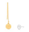 Un cercel are o placă netedă și o inscripție, atârnată pe un lanț.