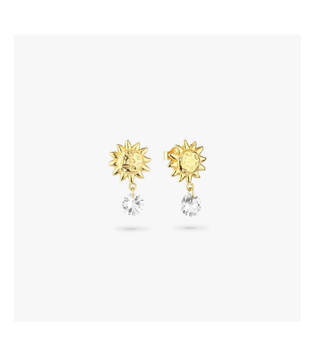 Cercei eleganți cu element decorativ în formă de soare și piatră agățată. Potriviti pentru femei.
