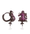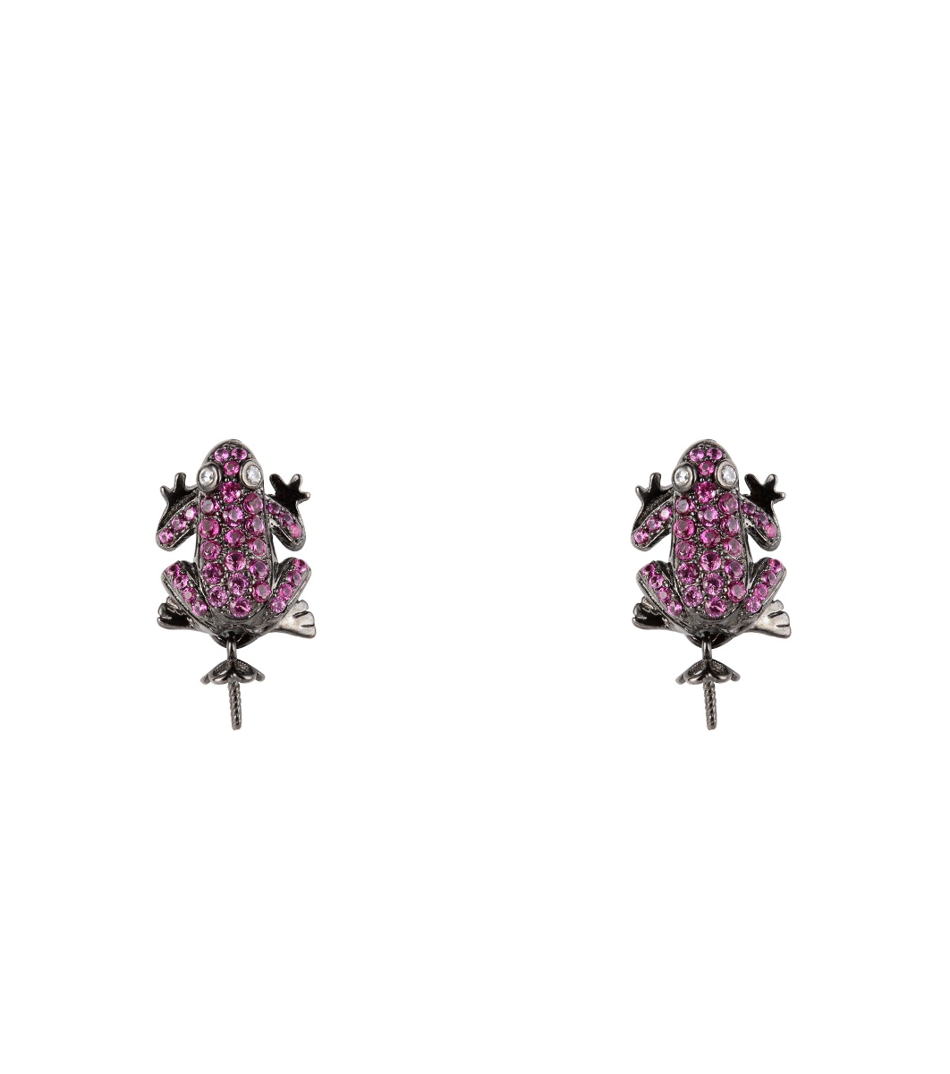 Cercei în formă de broască încrustați cu pietre strălucitoare. Lucrare detaliată care atrage atenția.