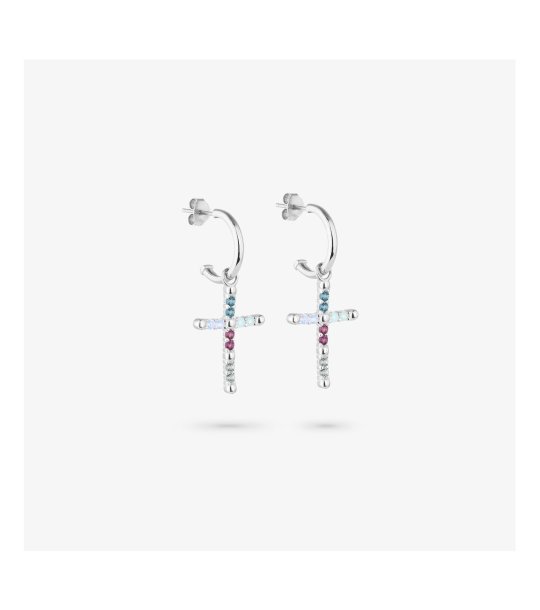 Cercei cu pandantiv în formă de cruce decorat cu diverse pietre. Pandantivul este prins de cercei care se închid cu un șurub. Potriviti pentru purtare zilnică.