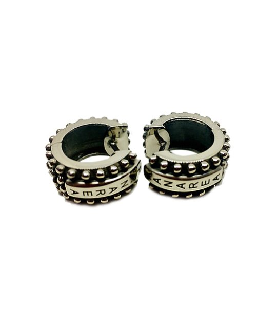 O pereche de cercei rotunzi cu un design unic. Au text gravat pe exterior și elemente decorative pe margini.