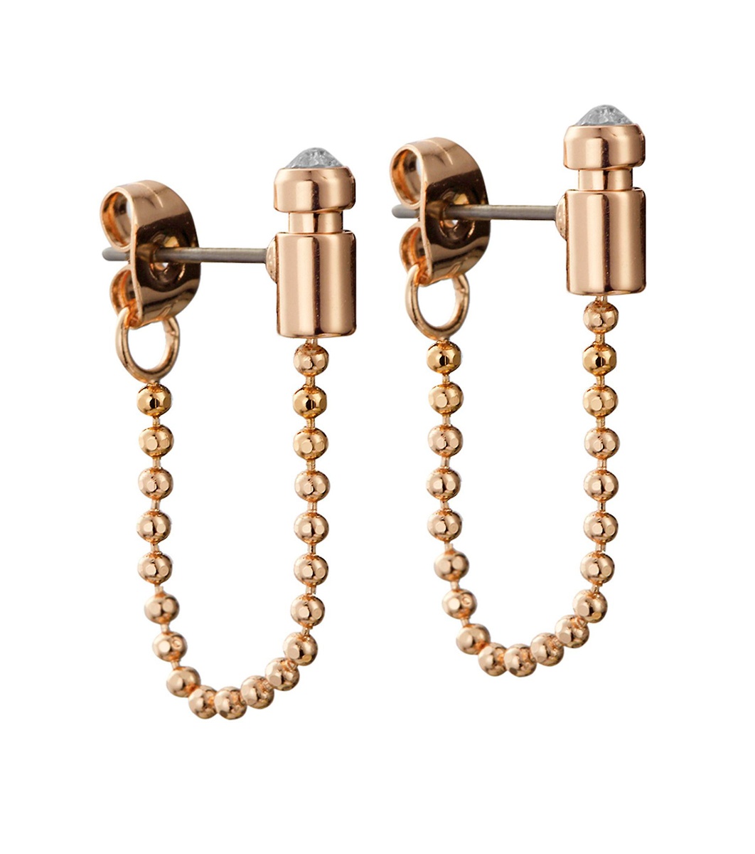 Cercei eleganți cu două părți conectate, în formă de lanț cu bile mici. Închiderea este clasică cu șurub.