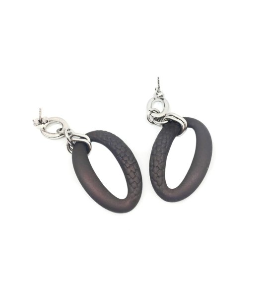 Cercei eleganți cu design oval, combinând diferite texturi. Închizătoarea are o clemă pentru o introducere ușoară.