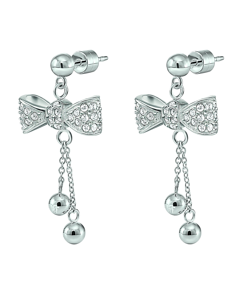 Cercei eleganți cu o panglică rafinată și pandantive fine. Decorați cu numeroase cristale mici, conferind o strălucire rafinată.