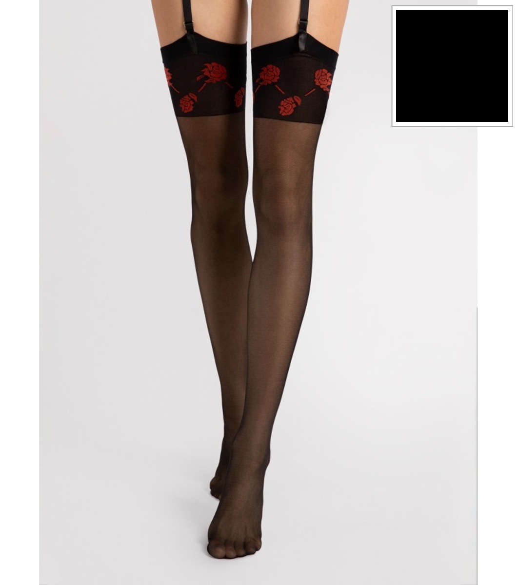 Ciorapi portjartier fini cu vârfuri imperceptibil întărite și elastan cu un singur strat pentru o durabilitate sporită. Partea superioară are un motiv floral figurat.